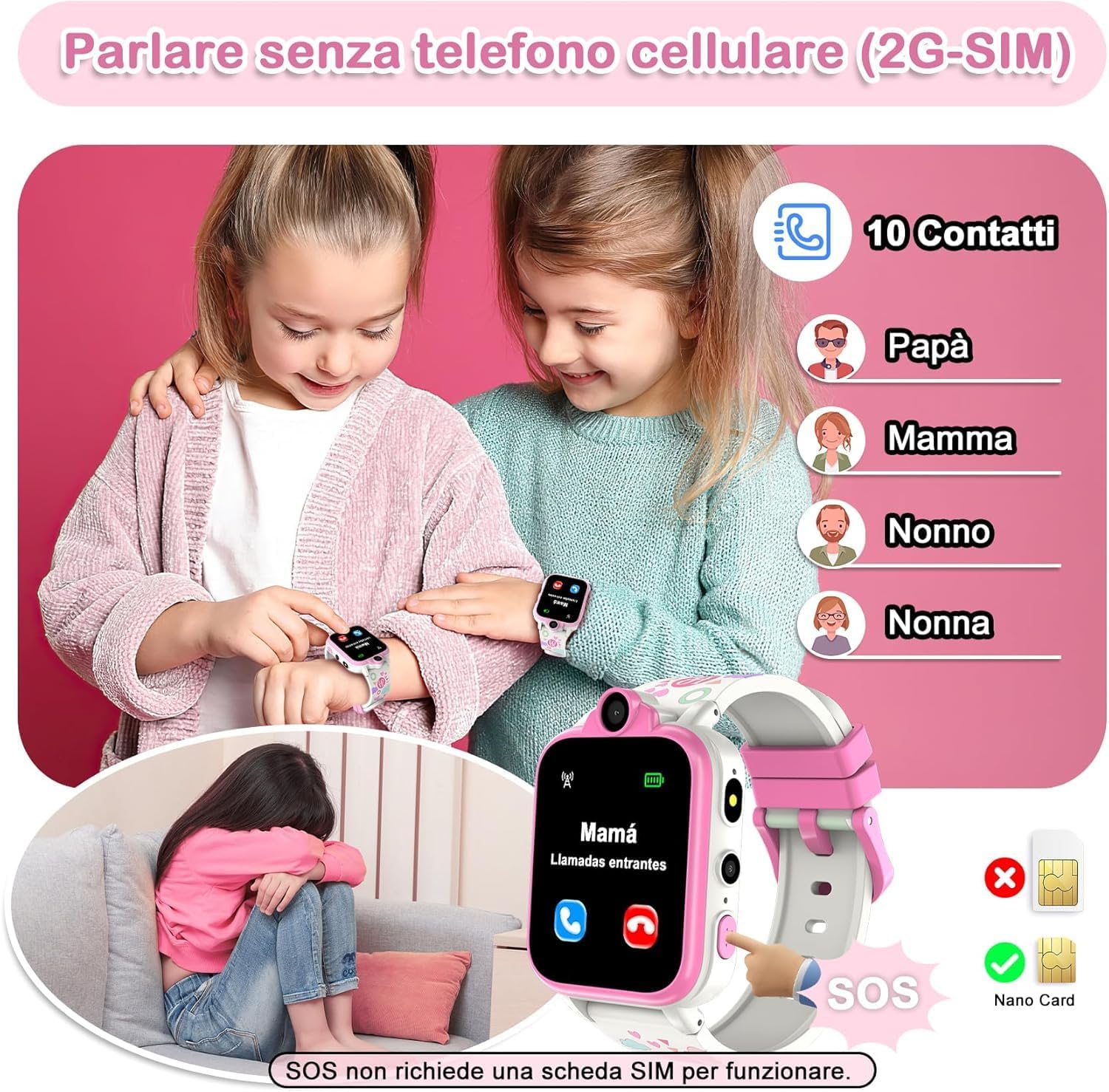Uno dei motivi per il quale è un ottimo orologio da comprare è che tramite il Gps integrato, l’Lbs, il Wifi e la possibilità di inserire una scheda Sim, scaricando un’app sul proprio cellulare, sappiamo in ogni momento la posizione della nostra bimba.Questo rende più tranquilli tutti i genitori quando i figli escono con gli amici, ma una cosa che può rendere ancora più sereni tutti, sia i bimbi che i genitori, è la presenza di un tasto SOS, infatti in caso di emergenza premendolo si chiede aiuto ai 3 numeri memorizzati sull’orologio.Grazie alla scheda Sim si possono effettuare delle videochiamate tramite le 2 telecamere posizionate sullo smartwatch, inoltre si possono fare chiamate vocali, chat vocali, mandare messaggi.Ha la calcolatrice, la sveglia, il cronometro, il contapassi, il monitoraggio del sonno, l’album fotografico, giochi.Per evitare distrazioni durante l’orario di scuola, c’è la modalità classe, grazie alla quale si può limitare l’utilizzo dell’orologio bloccando alcune funzioni, come i giochi e le chiamate, cosa che trovo molto utile.La durata della batteria è molto buona e la ricarica è veloce.Nella confezione troviamo un cinturino di ricambio in stoffa, 2 pellicole protettive, un kit per la rimozione della sim e per cambiare il cinturino, infine il manuale di istruzione in italiano.Un bellissimo regalo per i nostri bimbi o nipotini. Consigliato!!!!